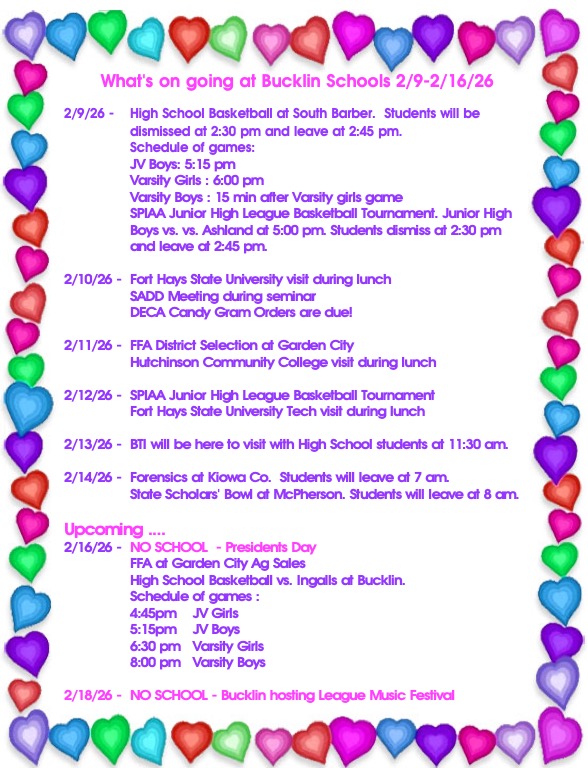 Announcements: High School Basketball at Hodgeman Co.. Good Luck Aces! Students will be dismissed at 2 pm and leave at 2:15. Schedule of games: 4:00 pm JV Girls5:00 pm JV Boys6:30 pm Varsity Girls ...