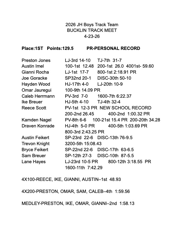 Announcements: REMINDER - Early Dismissal today at 2 pm. Junior High Track at Bucklin. Good Luck Deuces! Please see the order of events attached below.No Jock Route this friday.